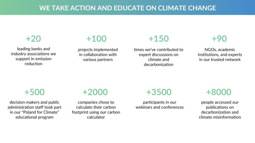 The support of our Polish and international partners enables us to carry out educational activities on climate change, carbon footprint, and corporate responsibility in these areas. These initiatives are primarily aimed at entrepreneurs and public opinion leaders, including journalists. Thanks to the generosity of our grantmakers, our educational tools and resources are publicly available and free of charge.